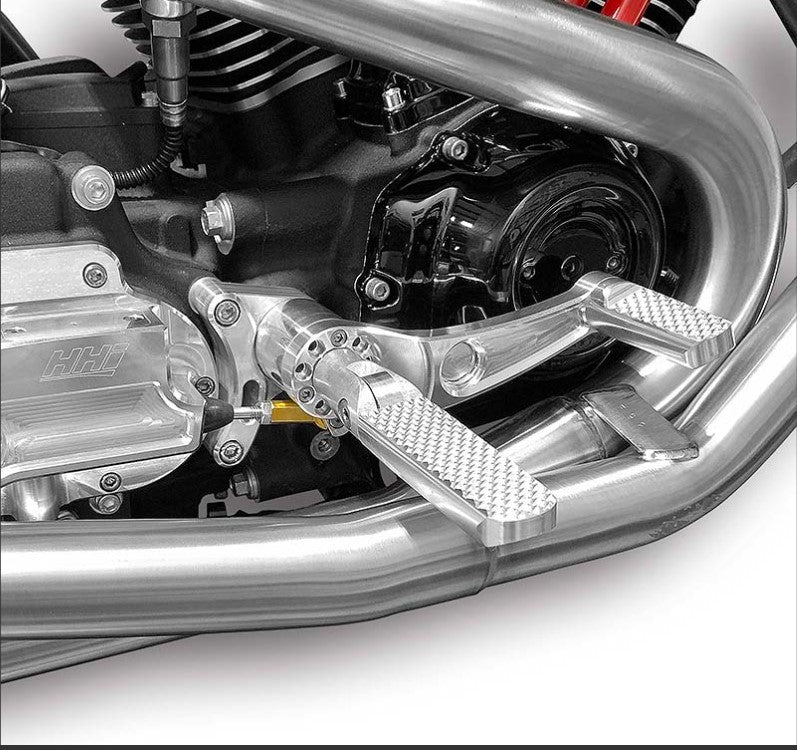 Works with both cable or hydraulic Touring Bike clutch applications and includes new aggressive HHI custom knurled pegs. Controls can be ordered without foot and toe pegs. This option will include a set of early style female clevis accepting most any male mount folding foot peg. Toe pegs will need threaded holes for 5/16" screws.