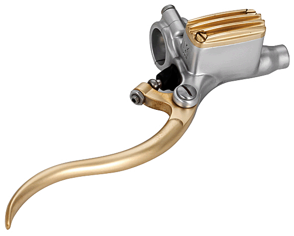 Brake master cylinder features forged aluminum body and clamp, forged brass finned master cylinder lid and forged brass lever for a true old school look!
