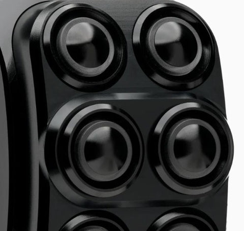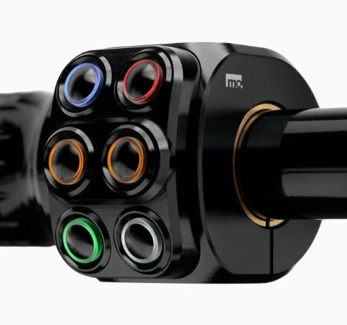 CNC machined from billet aluminum, the housing is black anodized. A hidden M4 stainless steel mounting screw clamps the unit securely to the handlebar.